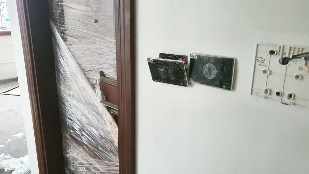 Phiên bản công tắc sử dụng cho ngôi nhà là phiên bản công tắc cảm ứng kính lõm viền bo champagne hiện đại, sang trọng vô cùng hài hòa với nội thất của ngôi nhà và hệ thống mặt ổ cắm đồng bộ công tắc.