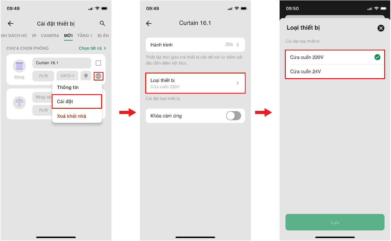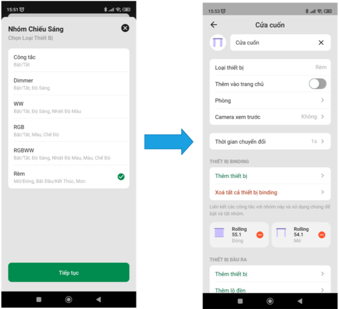 Để chọn loại cửa cuốn trên App, sau khi công tắc gia nhập vào mạng thành công