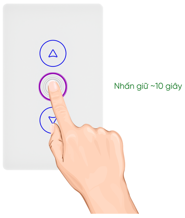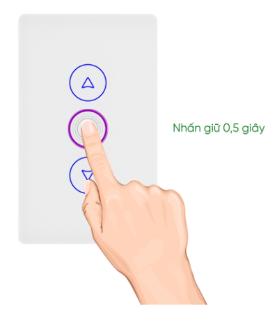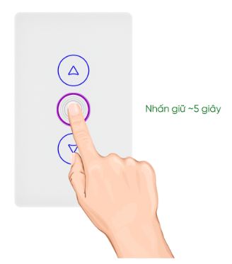 - Bước 1: Nhấn giữ nút “Dừng” (nút giữa) ~5 giây hoặc nút config ~ 5s trên thiết bị đến khi toàn bộ LED trên công tắc nháy hồng 2 lần thì nhả tay.