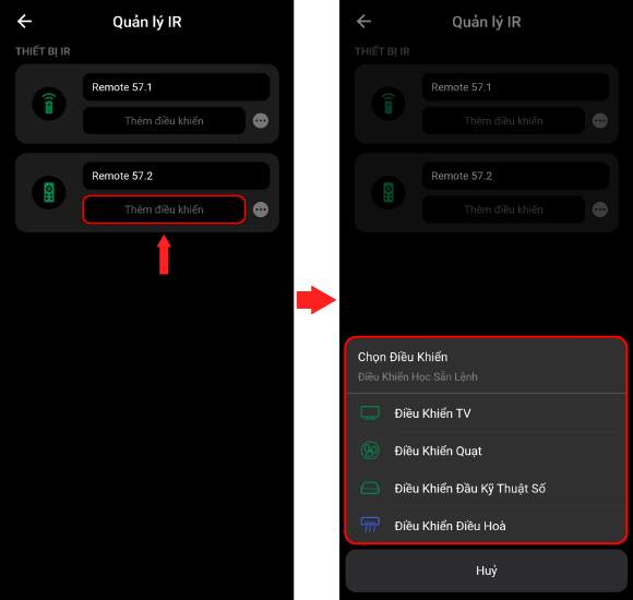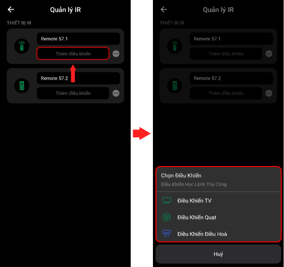 Chọn IR (Loại 2) có sẵn thư viện => Chọn “Thêm điều khiển” để thêm loại điều khiển muốn dùng.
