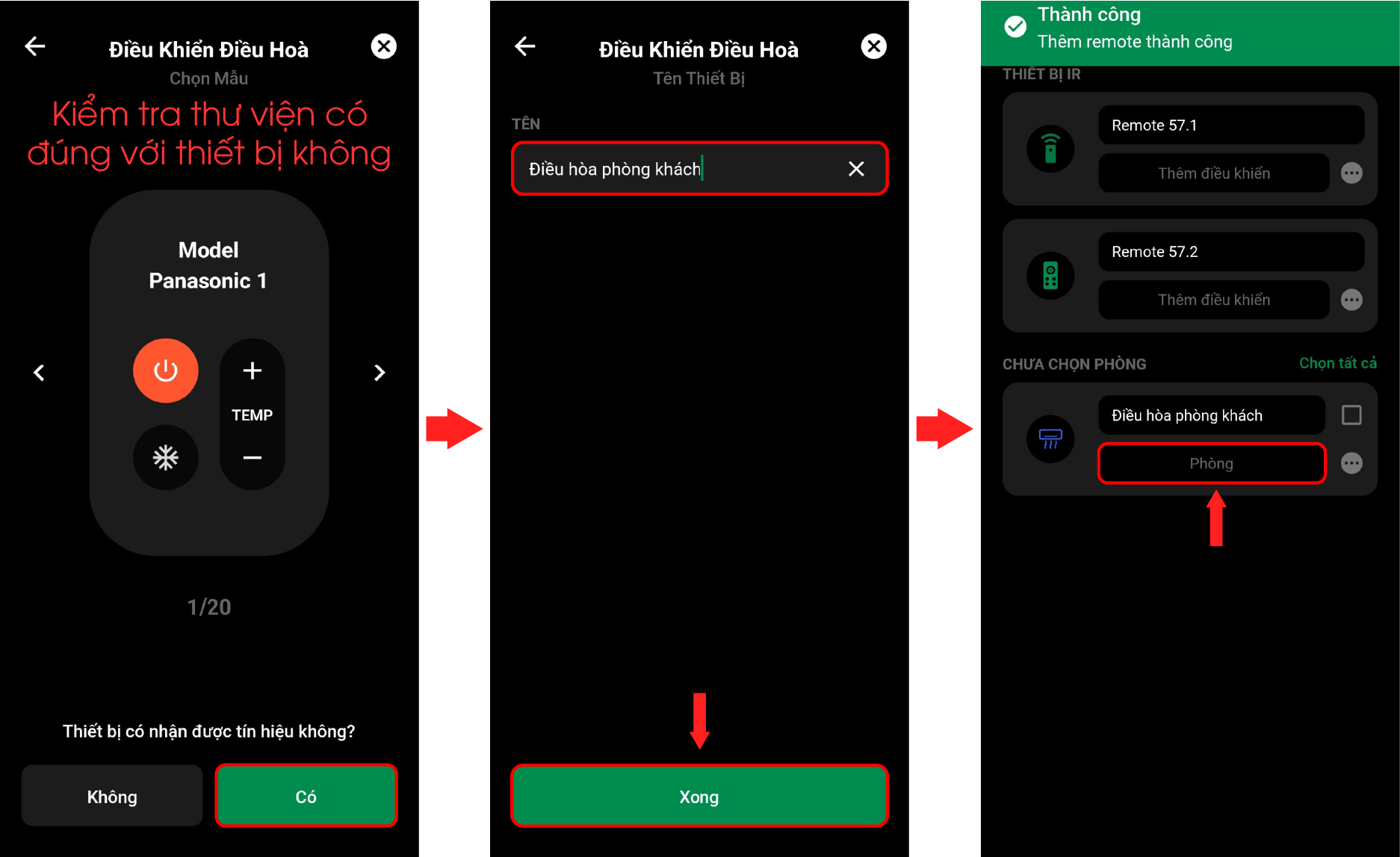 Nếu điều khiển được thiết bị thực tế -> người dùng chọn “Có” -> tiến hành đặt tên và cho Remote vào phòng.