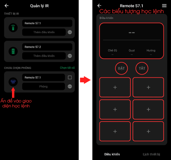 - Người dùng ấn vào các biểu tượng lệnh của Remote để tiến hành học lệnh.