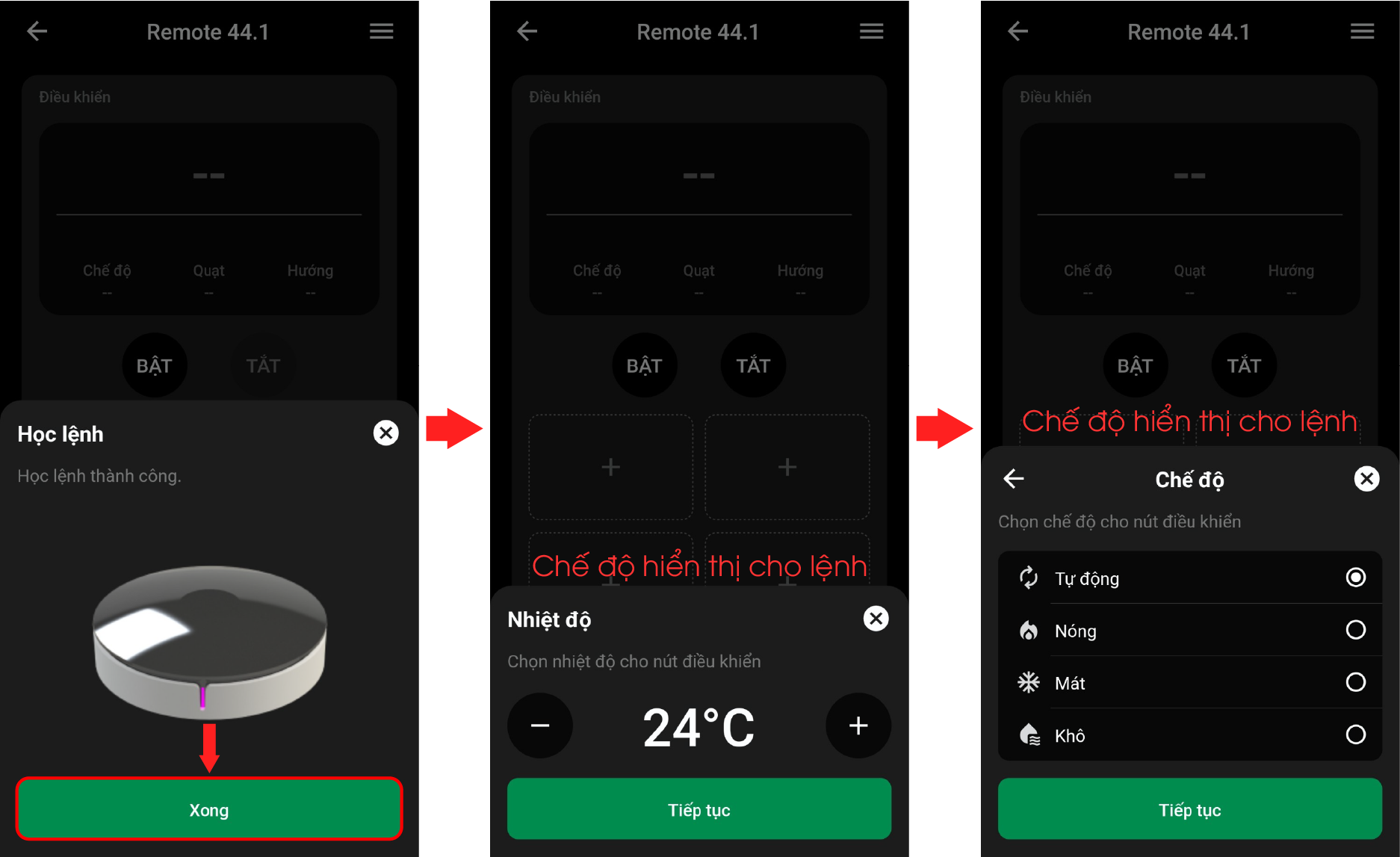 Sau khi học lệnh, người dùng ấn nút "Xong” để hoàn tất sau đó bắt đầu cài đặt chế độ hiển thị cho từng nút.