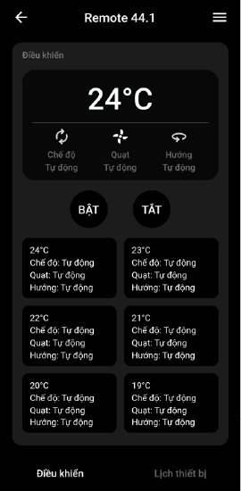 Để điều khiển thiết bị, người dùng nhấn trực tiếp vào biểu tượng lệnh tương ứng trên ứng dụng, lúc này đèn chỉ thị trên bộ điều khiển hồng ngoại sẽ nháy xanh 2 lần báo hiệu đã gửi lệnh điều khiển thành công.