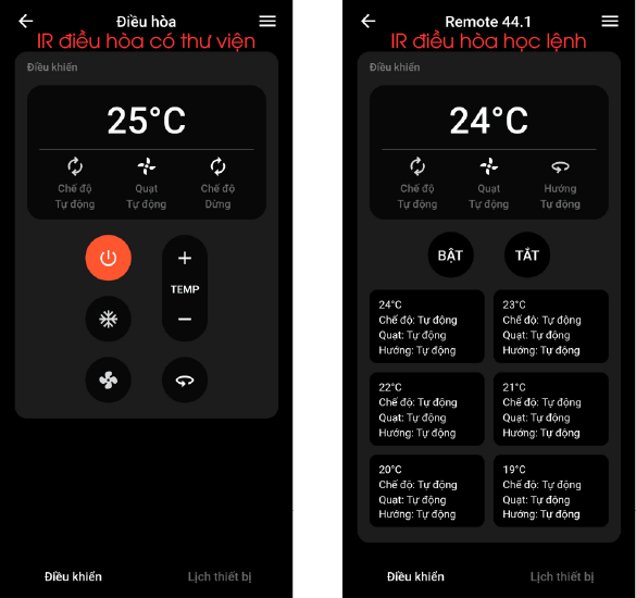 Thông thường với loại IR có sẵn thư viện, người dùng có thể dễ điều khiển hơn do cách lệnh được tinh chỉnh đúng với Remote thực tế, còn với IR học lệnh sẽ là các lệnh fix sẵn.