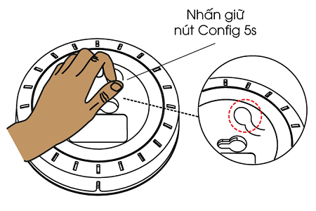 Để Reset thiết bị, người dùng ấn giữ nút Config trong 5s (nút nhựa tròn ở mặt dưới) cho đến khi đèn chỉ thị sáng hồng thì thả tay.