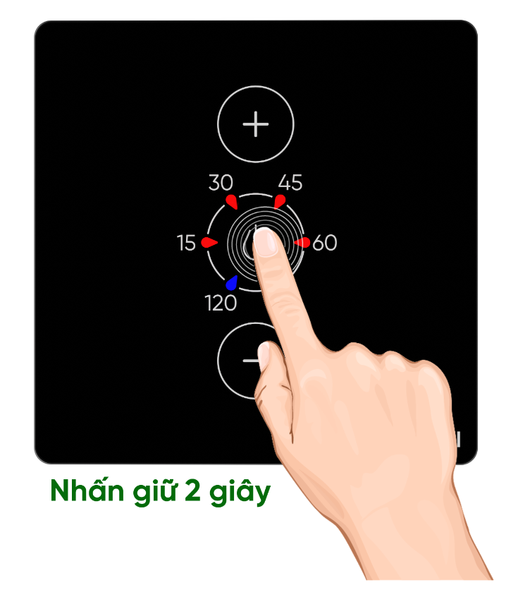 - Các mốc thời gian : 15, 30, 45, 60, 90, 120 phút. ( Công tắc đếm ngược, hết thời gian sẽ tự tắt)