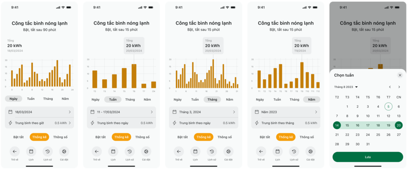 - Thống kê điện năng tiêu thụ: theo ngày, tuần, tháng và năm.
