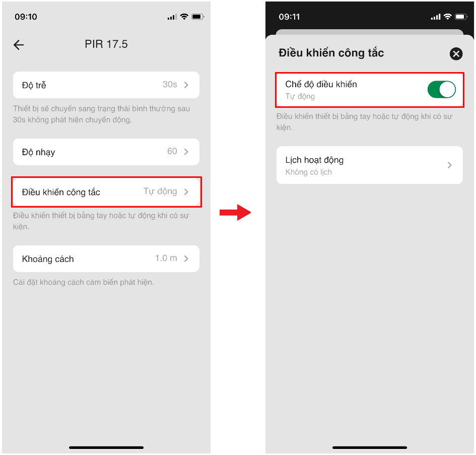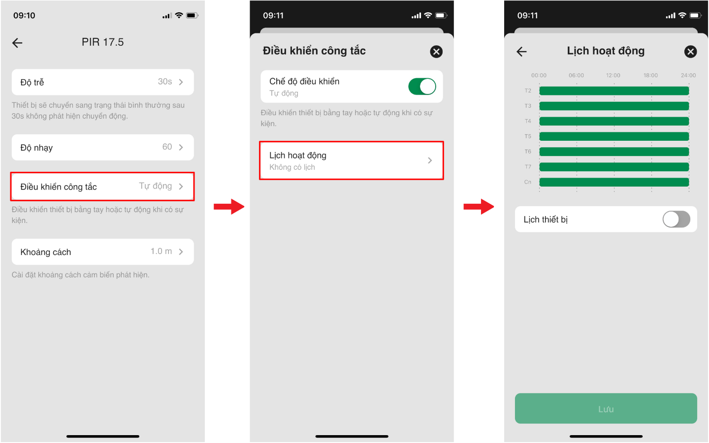 Ở chế độ “tự động” Công tắc cầu thang sẽ hỗ trợ “cài lịch hoạt động” cho thiết bị, để giới hạn thời gian tự động bật tắt của cảm biến.