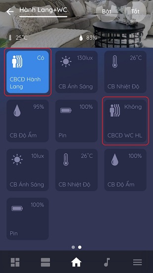 Trong giao diện phòng người dùng chuyển sang tab hiển thị cảm biến để xem trạng thái của cảm biến.