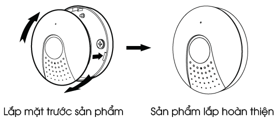 Đặt mặt trước thiết bị sao cho các ngàm của mặt sau trùng với các rãnh ngàm của mặt trước, sau đó xoay mặt trước theo chiều cùng kim đồng hồ để các ngàm ăn khớp vào rãnh.