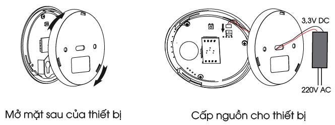 Xoay mặt trước ngược chiều kim đồng hồ để mở sản phẩm. Lắp bộ biến đổi nguồn được cấp kèm theo sản phẩm.