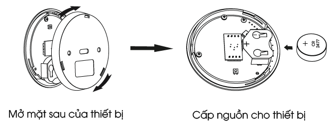 Xoay mặt trước ngược chiều kim đồng hồ để mở sản phẩm. Sau đó lắp pin được cấp kèm vào khay đựng pin trên thiết bị.