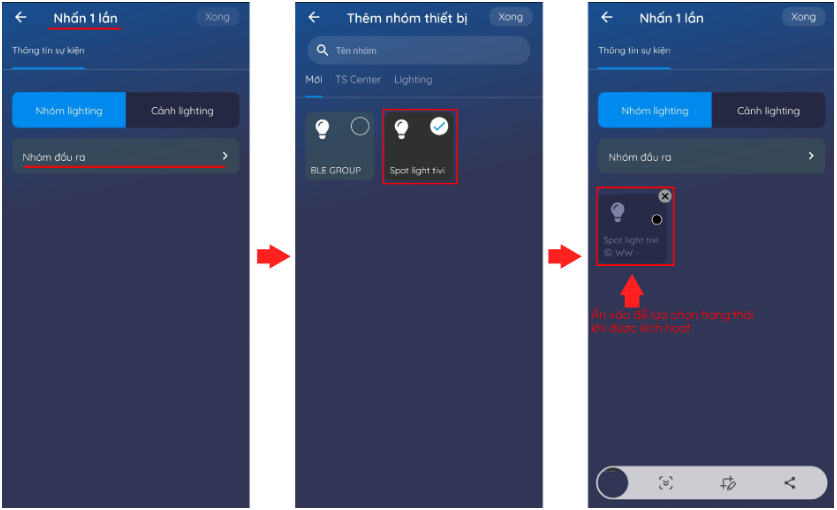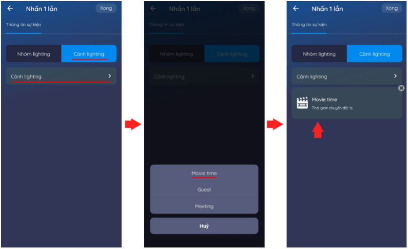 Đối với sự kiện Nhấn 1 lần, 2 lần, Giữ ta có thế hoặc kích hoạt trực tiếp Nhóm Lighting - Cảnh Lighting theo như cấu hình trên App.