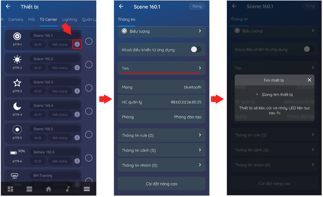 Trong trường hợp không tìm thấy thiết bị, người dùng có thể bật tính năng "Tìm" trong giao diện nâng cao. Một lúc sau thiết bị sẽ nháy Led và bật còi báo.