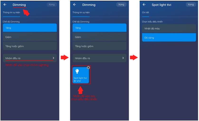 - Sự kiện Dimming*:* Ở đây ta sẽ có 3 sự lựa chọn: Tăng, Giảm, Tăng hoặc Giảm dùng để tăng/giảm độ sáng hoặc nhiệt độ màu của đèn Smart Lighting.