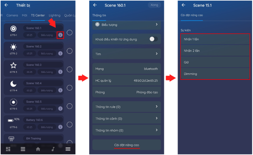 - Ngoài ra sự kiện của nút cảnh cũng có thể kích hoạt trực tiếp các Nhóm Lighting, Cảnh Lighting mà không cần thông qua HC.